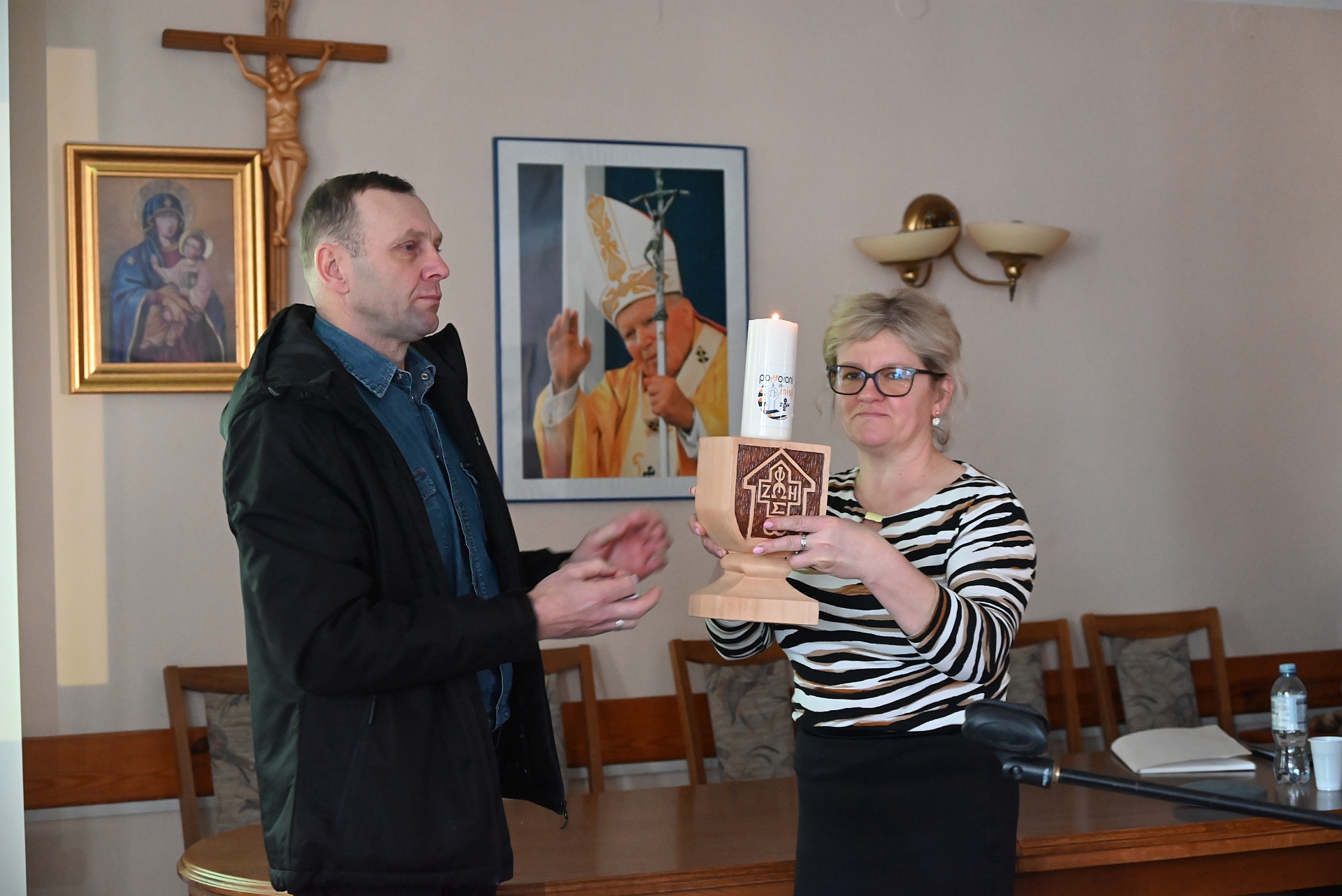 Św. Józef. Jak to on – był obecny na tych rekolekcjach w tle. Miał swoje miejsce na piedestale, ale jakoś on do cokołów w ogóle nie pasuje. Działał w tle, zza kurtyny. Tak myślę, że to właśnie dzięki niemu wszystko się spięło, zagrało – słowem udało wyśmienicie. Uczył dyskretnie, pomagał niewidzialnie. I w tym cały urok tego Świętego. Określa się go patriarchą Nowego Testamentu tak jak Abraham był patriarchą Starego Testamentu. Obaj wystawieni na próbę zaufania. Obaj przeszli ją pomyślnie. Zatem Józef uczy zaufania. Jak dla mnie Św. Józef w moim prywatnym panteonie stoi tuż obok Św. Faustyny. Owo „Jezu ufam Tobie” jest tym co u podstaw, jak fundament łączy te dwie postacie – zaufanie. Może w moim/naszym życiu nie pojawiła się konieczność dokonywania tak dramatycznie jednoznacznych wyborów, ale życie w ogóle składa się z całej serii drobnych wyborów. Ich suma już nie jest banalnym wynikiem. Od nich uzależniony jest kierunek w którym ostatecznie zmierza moje życie. Dla nas osobiście Św. Józef jest przedziwną postacią. Takim opiekunem, którego mocy skuteczności nie sposób przecenić, ale dostrzega się ją dopiero po czasie. On jak się okazuje jest z nami przez całe nasze małżeństwo. Zawarliśmy je przed obliczem Jezusa i to Chrystusa Króla w Sanoku by bezpośrednio po tym fakcie trafić wprost w opiekę Św. Józefa do Niska. To on maczał palce gdy szukaliśmy pracy i ja, i Aneta. On nam znalazł wprawdzie małe, ale własne i przytulne mieszkanko w cenie równej temu co posiadaliśmy choć dookoła wszystko było przynajmniej (na tamte czasy) dwa razy droższe. To on nas oddał na chwilę Św. Janowi Pawłowi II do Stalowej Woli, gdzie ze względu na potrzeby naszego syna posługiwaliśmy jakieś 9 lat. Wreszcie to na obrazku z jego wizerunkiem ks. Robert Zachasz (kapelan szpitala w Nisku) wystawił „potwierdzenie” faktu, że byłem w krytycznym momencie, stojąc na granicy życia i śmierci opatrzony sakramentami. Tyle tak na szybko możemy zobaczyć w tej chwili, a pewnie jest tego znacznie więcej. Od momentu gdy na stałe weszła do naszej rodziny modlitwa rodzinna – modlitwa do Św. Józefa jest odmawiana codziennie. Ja szczególnie wypowiadając jej słowa kładę akcent na te dwie prośby: wprowadź Jezusa do naszego domu oraz pomóż przyjąć go do serca. One też uzmysławiają mi, że Józef jest nie mniej chrystocentryczny niż Maryja. Potem mówimy tak „uproś łaskę miłości, zgody i pokoju” i jakby na to nie patrzeć tak się dzieje w naszym życiu, że te przymioty istnieją, są realne, a odstępstwo od nich jest bólem i nieszczęściem. To wreszcie Józef najlepiej uczy, prawdy obecnej w Ruchu, prawdy sztandarowej, podstawowego charyzmatu: posiadania siebie w dawaniu siebie.